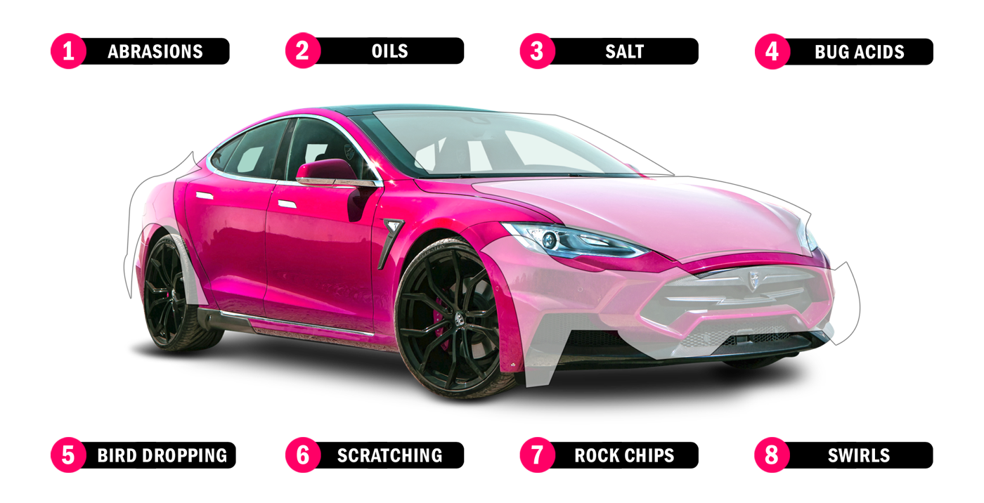 PPF serves as a barrier against oils, salts, and acidic substances such as bug acids and bird droppings, preventing chemical damage and preserving the vehicle's finish.